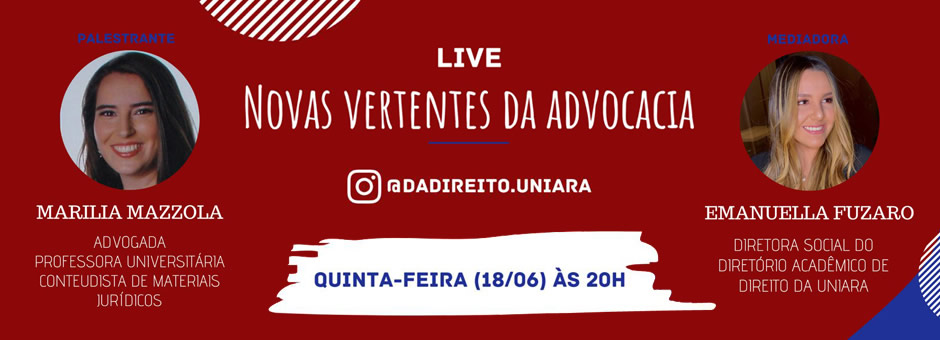 O Diretório Acadêmico de Direito da Universidade de Araraquara - Uniara realizará, no dia 18 de junho (quinta-feira), a live Novas Vertentes da Advocacia. Com mediação da Diretora Social do Diretório Acadêmico, Emanuella Fuzaro, o evento contará com a participação da advogada e conteudista de materiais jurídicos, Profa. Marília Rodrigues Mazzola.
